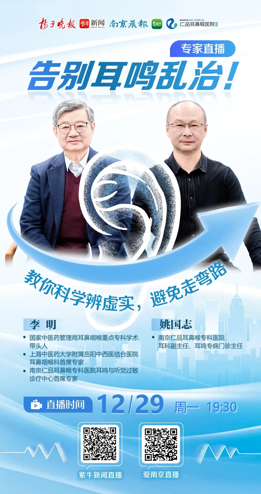 别再盲目试错了!12月29日(周一)19:30,一场专为耳鸣患者量身打造的权威直播即将开启。此次直播特别邀请国家中医药管理局耳鼻咽喉重点专科学术带头人、上海中医药大学附属岳阳中西医结合医院耳鼻咽喉科首席专家李明教授,南京仁品耳鼻喉专科医院、耳科副主任、耳鸣专病门诊主任姚国志,以“告别耳鸣乱治”为主题,用专业力量拨开耳鸣治疗的迷雾。