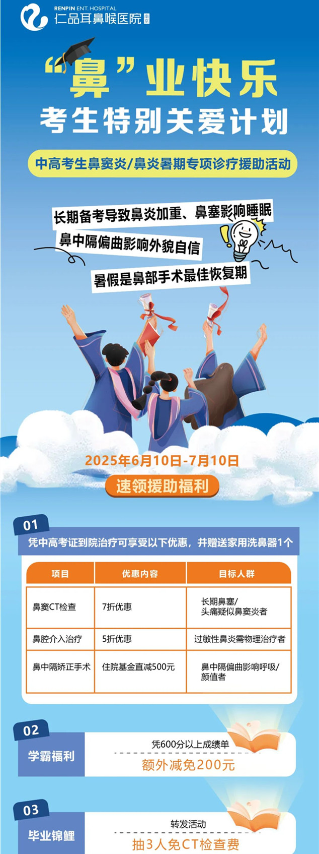 为了助力考生们健康“焕新”,6月10日至7月10日,南京仁品将启动“‘鼻’业快乐考生特别关爱计划——中高考生鼻窦炎/鼻炎暑期专项诊疗援助活动”,以精湛医术、先进设备和贴心的福利,帮助广大考生以全新的面貌和健康的身体开启新的人生篇章!