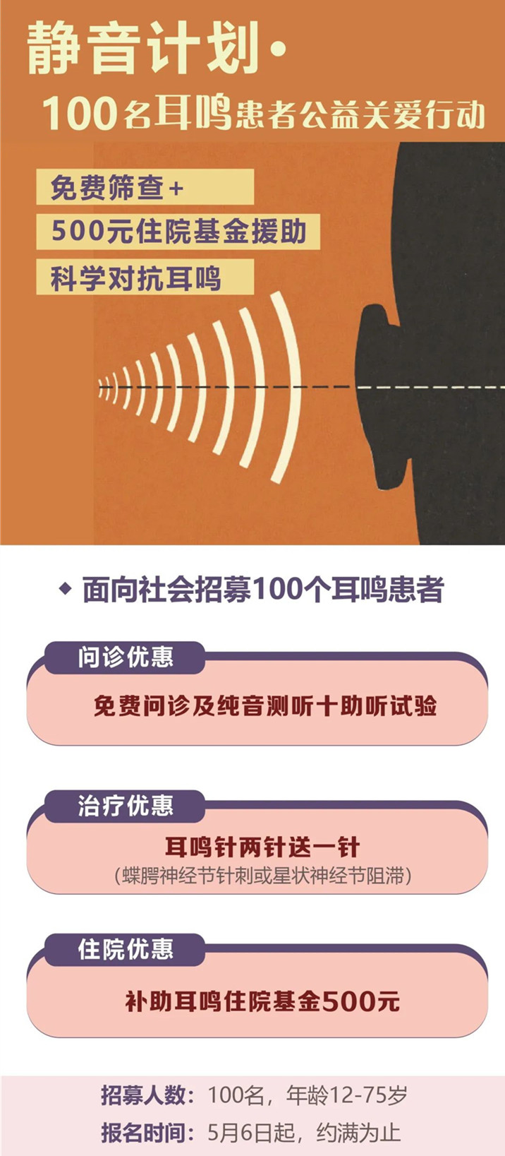 由南京仁品发起的“静音计划·100名耳鸣患者公益关爱行动”招募名额已经所剩不多,现在报名还可以享受多项公益福利,全面助力耳鸣患者的静音之旅!