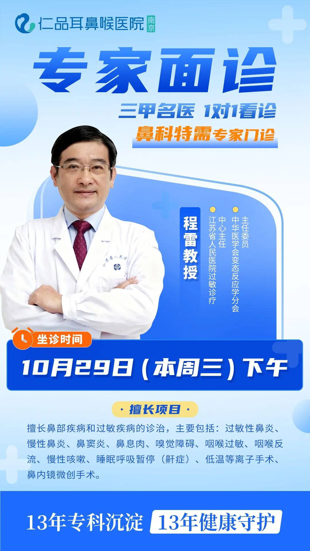 为了帮助更多鼻炎患者摆脱困扰,10月29日本周三下午,南京仁品耳鼻喉专科医院将特邀中华医学会变态反应学分会主任委员、江苏省人民医院脱敏诊疗中心主任程雷教授到院坐诊!让权威专家为您量身制定精准治疗方案,告别喷嚏鼻涕的烦恼,享受桂花飘香的秋天。