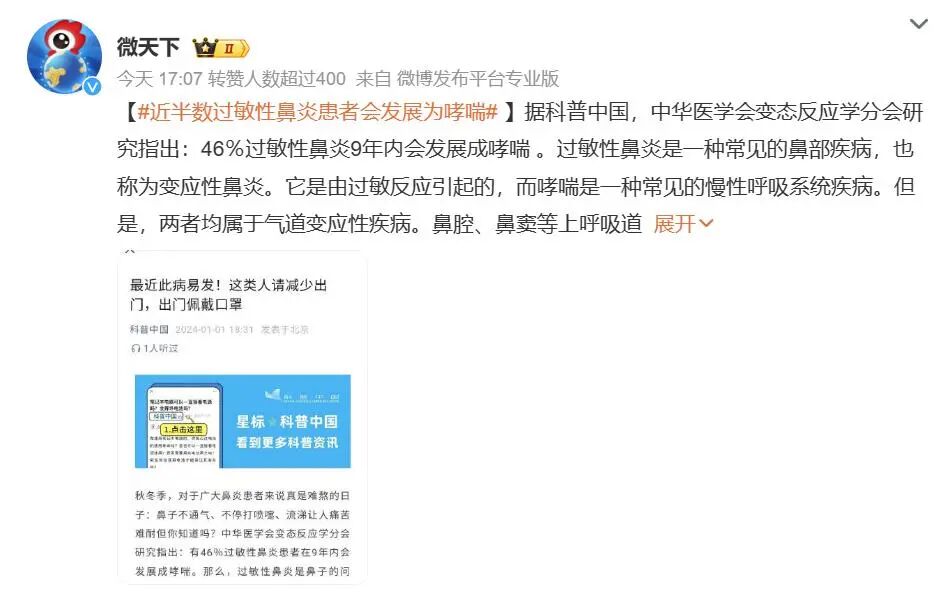从鼻塞、流涕,到胸闷、气喘、呼吸困难……这绝不是危言耸听。有研究数据显示,46%的过敏性鼻炎9年内会发展成哮喘(数据来源:《科普中国》)。
