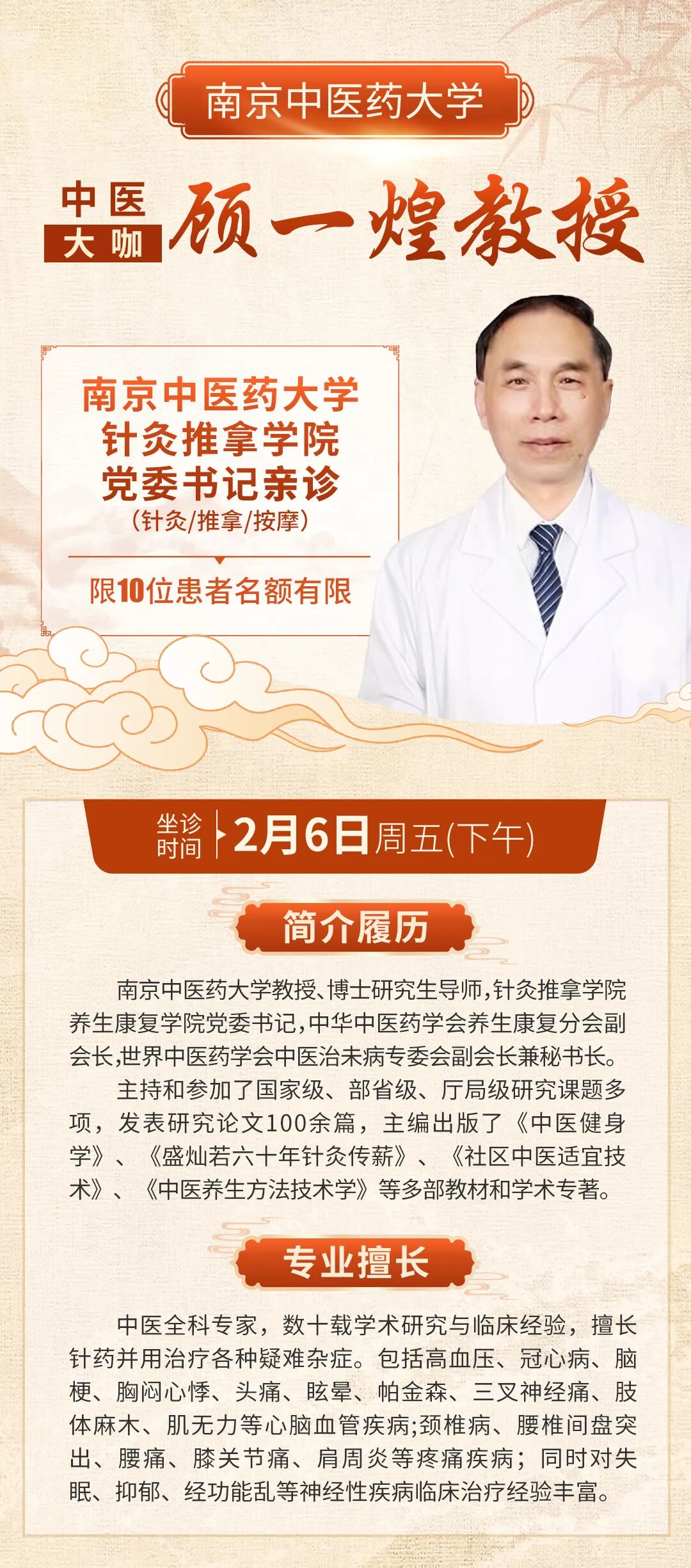 南京中医药大学博士生导师、针灸推拿学院养生康复学院党委书记顾一煌教授是知名中医全科专家,从事中医学术研究、临床工作数十年,擅长针药并用治疗颈腰椎病、关节炎等各种痛症,以及心脑血管疾病、失眠、抑郁等疑难病。