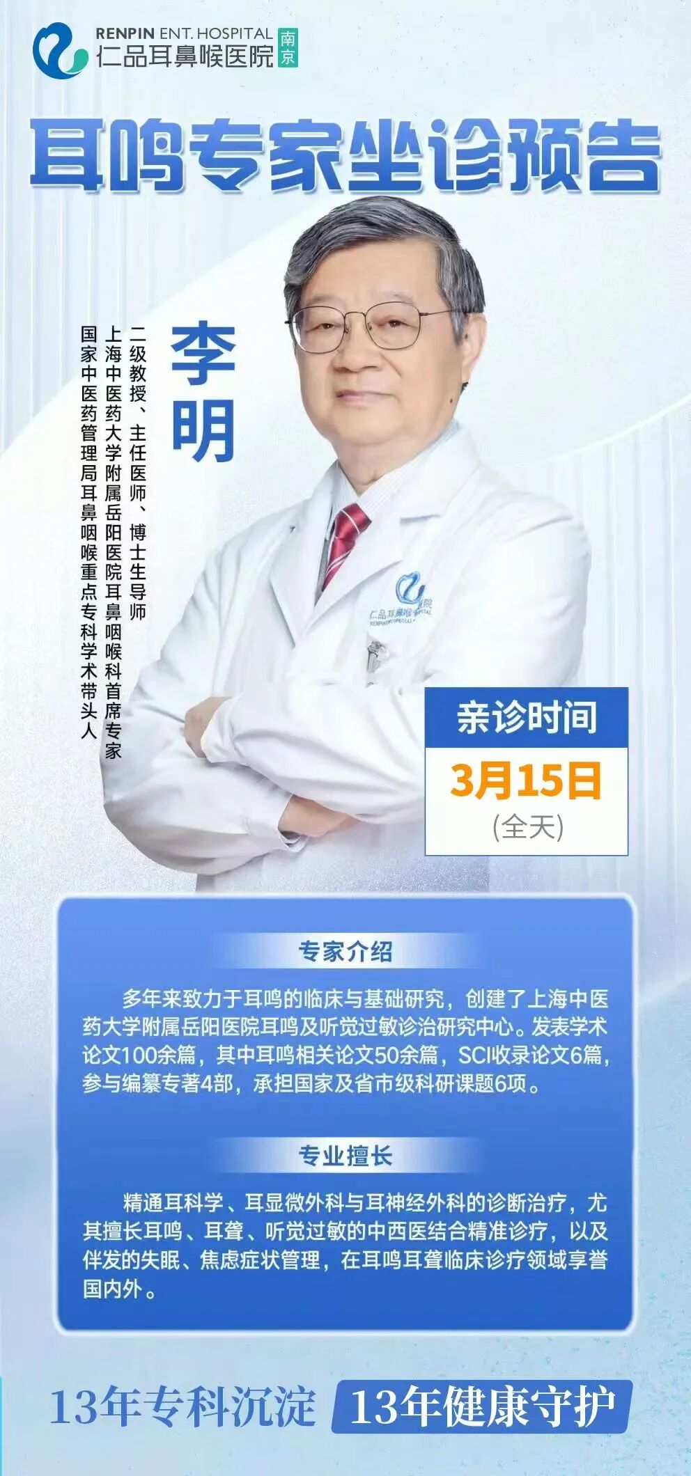3月15日,耳鸣专家、国家中医药管理局耳鼻咽喉重点专科学术带头人李明教授,将亲临南京仁品耳鼻喉医院坐诊,面对面为你破解耳鸣难题,给你一次重获安宁的机会!