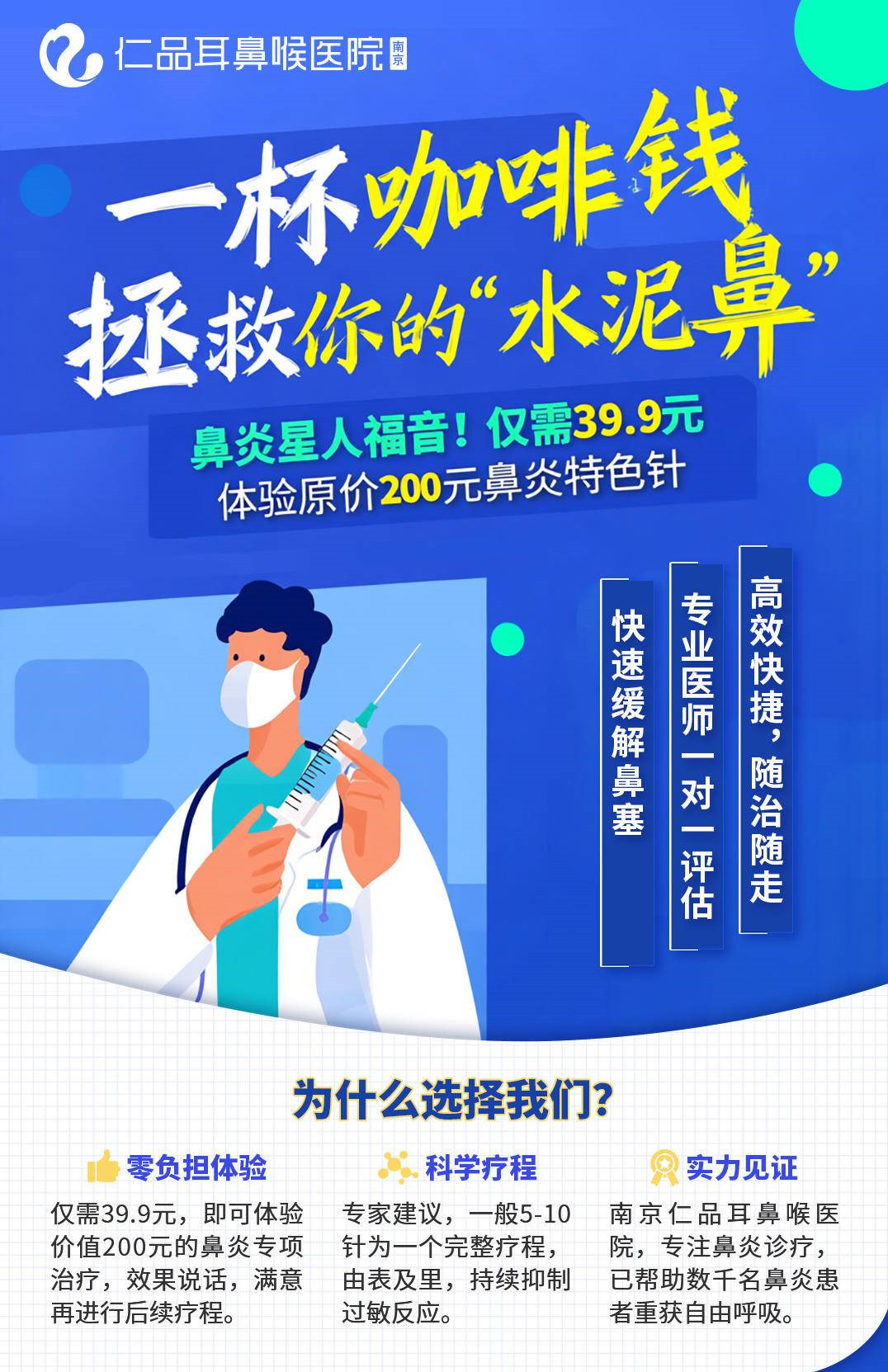 鼻炎进入高发季。为帮助广大市民有效缓解这一季节性健康困扰,南京仁品耳鼻喉专科医院即日起推出“鼻炎针”低价体验公益活动,原价200元的鼻炎针,现在仅需39.9元即可体验一次,让更多患者能够以亲民的价格体验精准治疗。